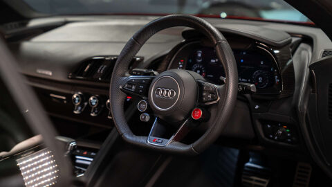 - R8 3-Spoke - Flat Bottomed - Multifunctional - Perforated Performance Leather Steering Wheel with 3 Operating Satellites including Performance Mode